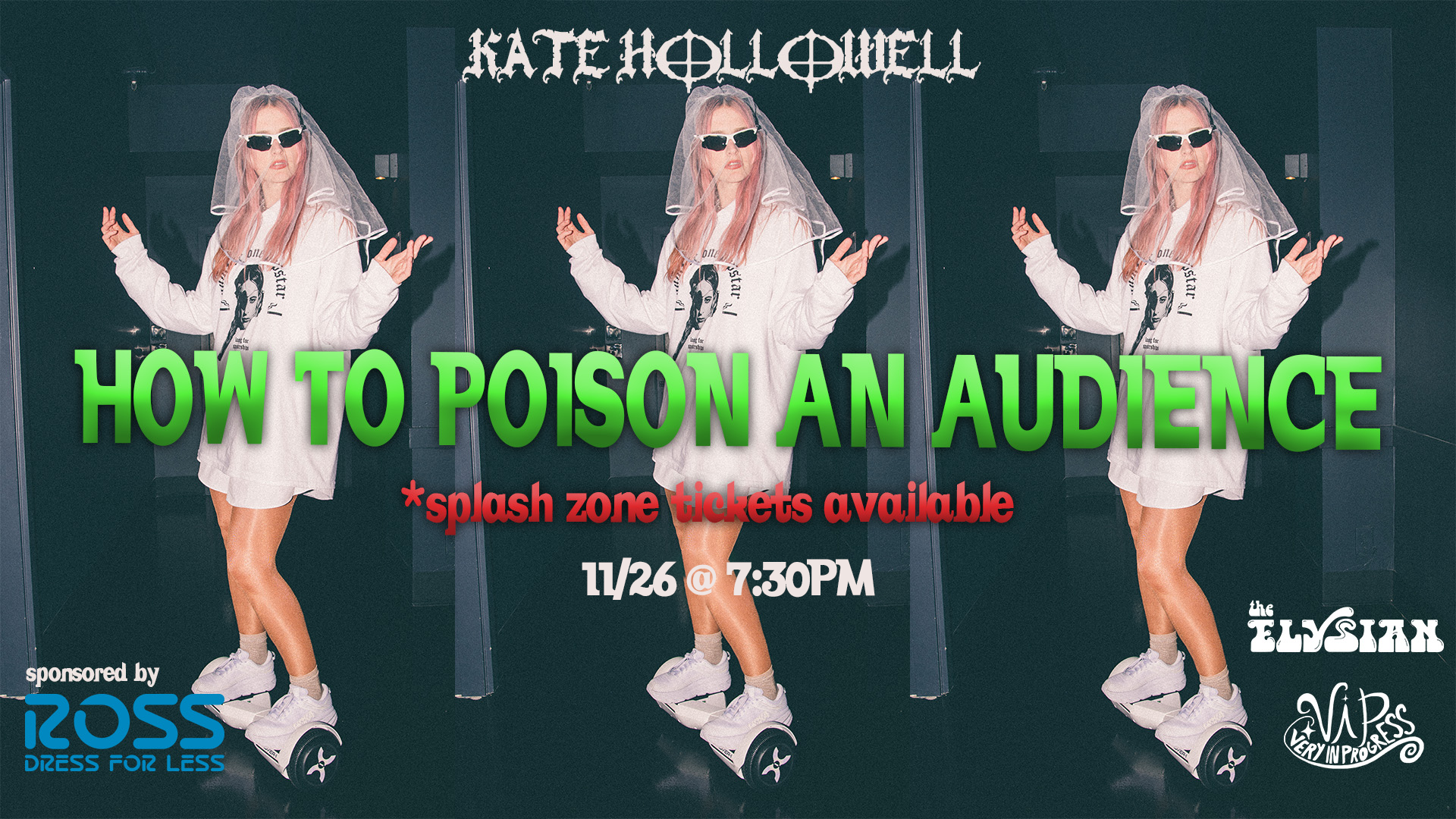 ROSS DRESS FOR LESS brings you a KATE HOLLOWELL PRODUCTION of NUMBER ONE POPSTAR in HOW TO POISON AN AUDIENCE: A HOPEFULLY SOLD OUT PRODUCTION also brought to you by MONSTER ENERGY DRINK and LES SCHWAB TIRES…splash zone tickets available.