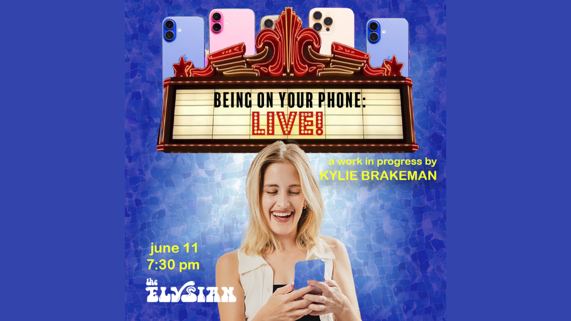 Join comedian Kylie Brakeman as she brings the singular experience of being on your phone out of your hand and onto the stage, finally LIVE and in the flesh! One audience, one phone, one unforgettable night of American theater!