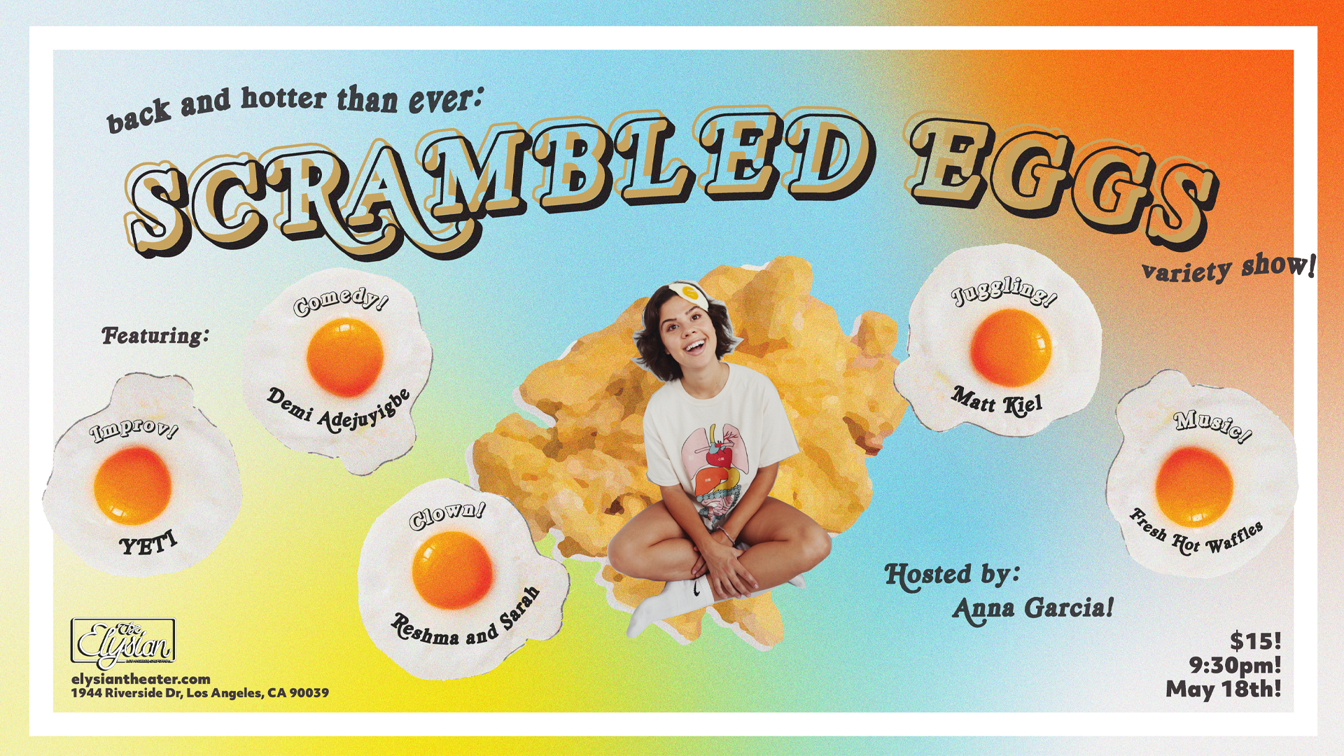 Anna asks all her insanely talented friends and local legends to perform, with acts ranging from clowning to musical performances to burlesque to stand-up to puppetry to characters to whatever Anna's little grinch heart desires. It's usually pretty chaotic and everyone that performs is always hot. As for the name, it's kind of like the performers are the eggs and then they are scrambled around? You get it! Now get your butt in here!